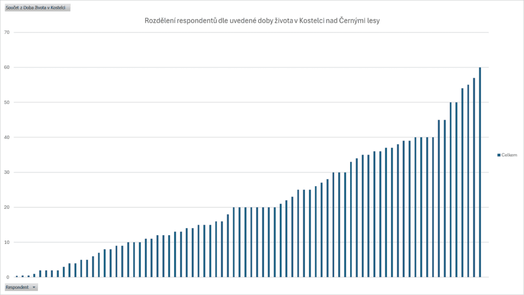 Pohled na délku života respondentů v Kostelci přináší důležitý kontext. Medián doby života ve městě je přibližně 20 let, odpovídali tedy převážně dlouhodobí obyvatelé. Právě u nich se přitom objevuje výrazná kritika – zejména v tématech, jako je doprava, technická infrastruktura, kanalizace, chybějící koncepce rozvoje a způsob vedení města. Nejde tedy o nespokojenost „náplav“, ale o hlas lidí, kteří město sledují dlouhodobě a porovnávají jeho vývoj v čase. Naopak v oblasti komunitního života se rozdíly mezi skupinami téměř stírají.